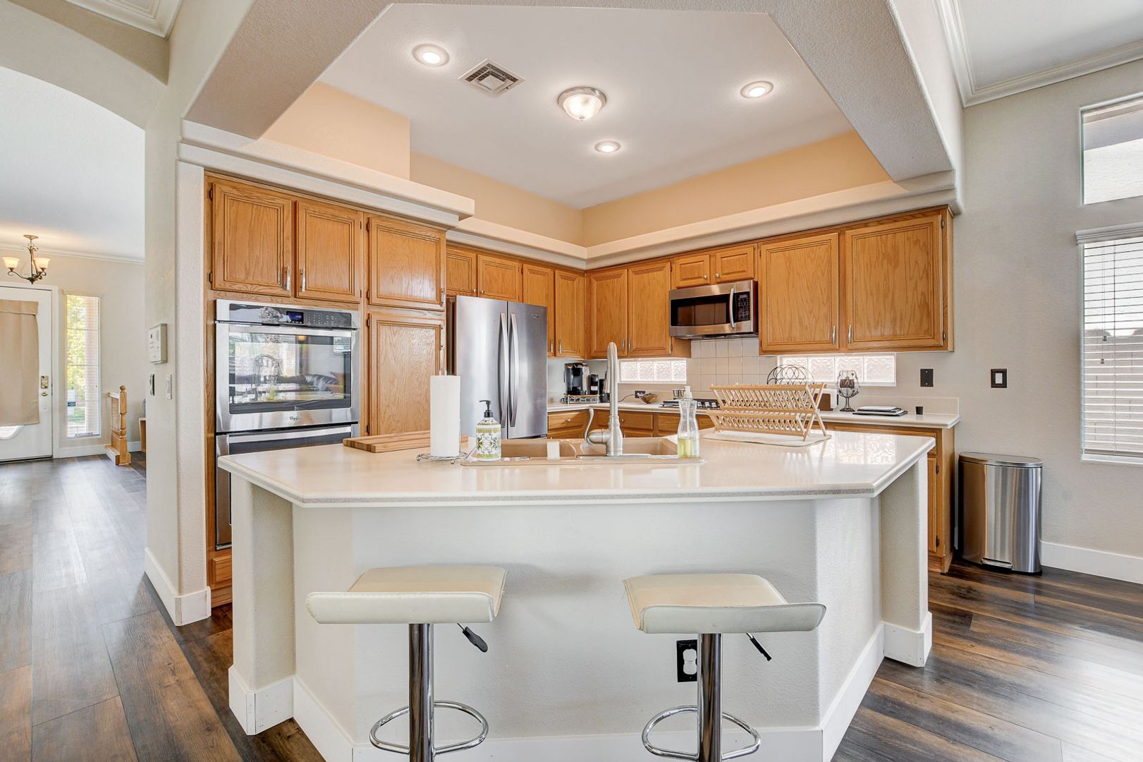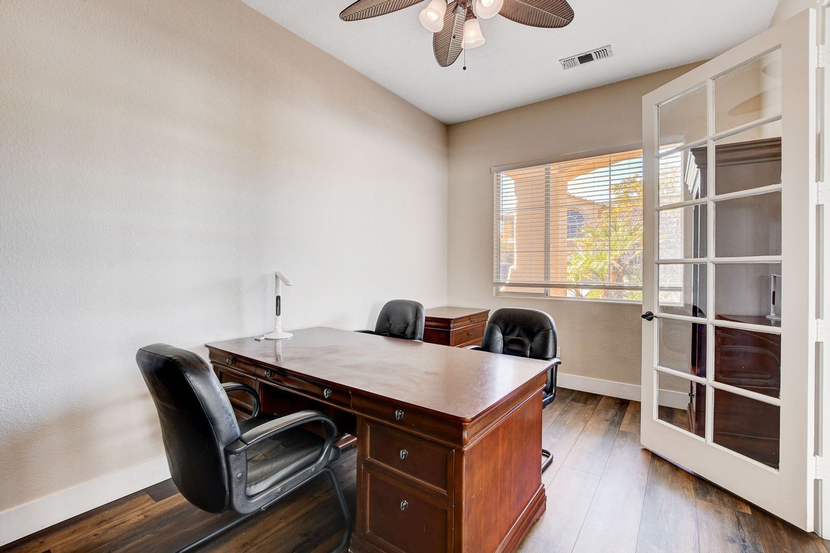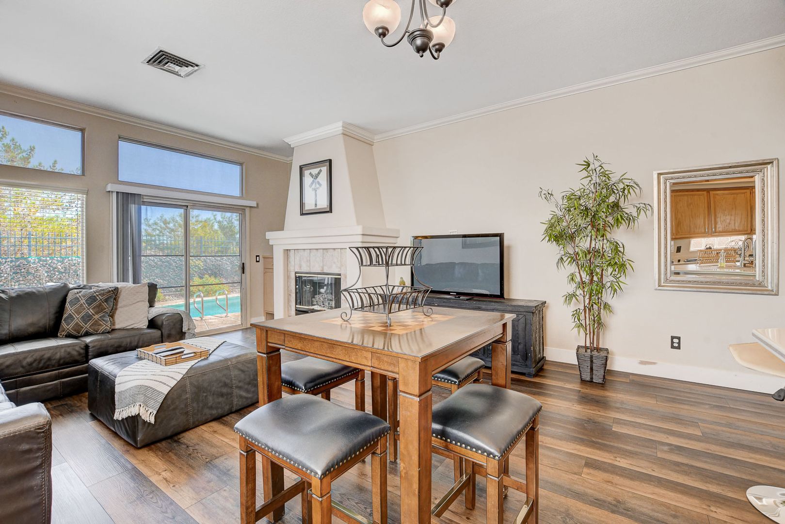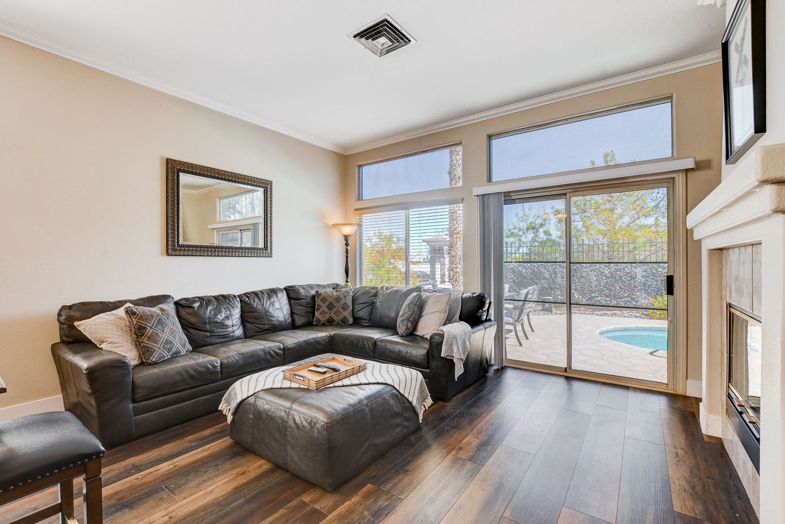 A beautifully appointed, fully furnished 2-bedroom home with a den, located in the heart of the Seven Hills master-planned community. This light-filled residence features an open, flowing floor plan from front to back, with formal living and dining areas complemented by an attached den—perfect for a home office or study. The kitchen opens to the family room and showcases stainless steel appliances and a breakfast bar on the island. Backyard low maintenance complete with a pool and spa, built-in BBQ, and patio seating with a cozy fireplace. The spacious primary suite offers a good amount of closet space, and a water softener is included for added comfort. Tenant currently in place and flexible with showings; 24-hour notice required through the listing agent. Tenant is responsible for monthly pool and landscape services.